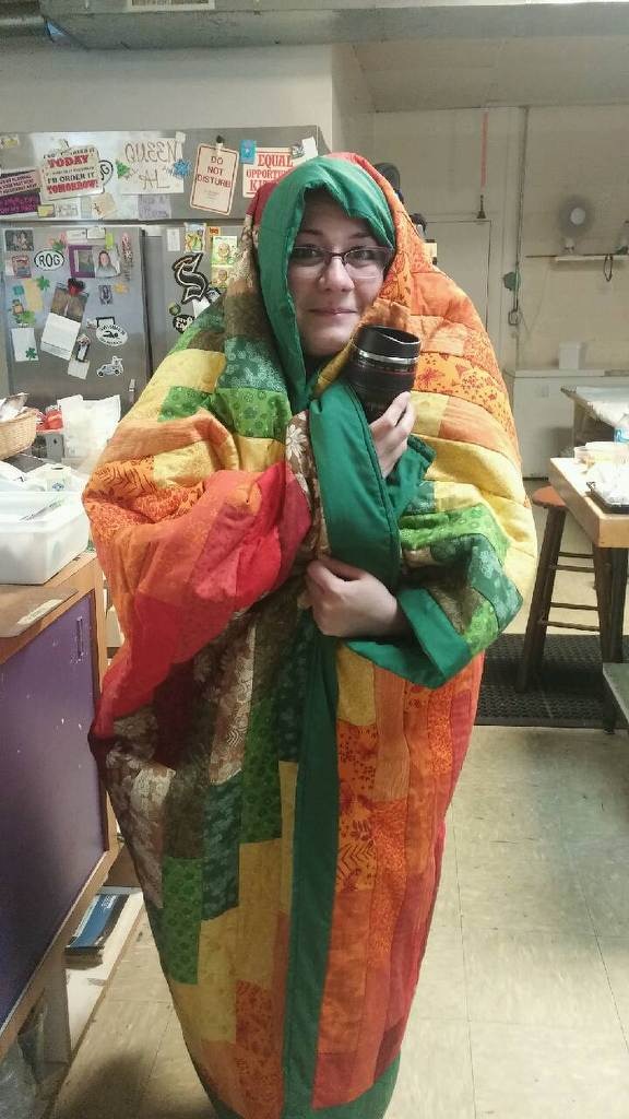 Today I got a message from my best friend who got the quilt. It included these pictures. She works in a bakery so that's whats going on. Needless to say I think she is quite enjoying her new cocoon.